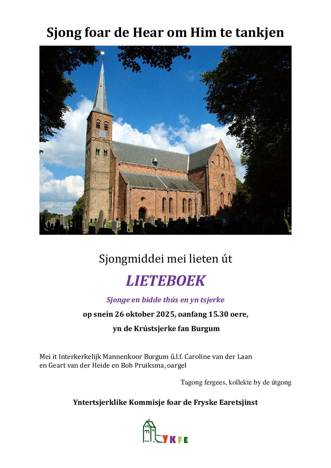 Fryske sjongmiddeis Opnames 8 oktober 2023 Martinitsjerke Boalsert Programma 1. Yntrada – Koperkwintet 2. Iepening – Anna Marike Dijkstra – van der Woude 3. Liet 146a: 1, 6 en 7 4. Liet 97: 1, 5 en 6 5. Liet 176: 1, 2 en 6 6. Psalm 42: 1, 2 en 7 (Anders Minnes Wijbenga) 7. Oargelsolo: ‘O Durchbrecher aller Bande’, Sifrid Karl-Elert 8. Kirchentaglied ‘Halleluja, loovje de Hear’ 9. Kitchentallied: ‘Sykje en freegje’ 10. Liet 330 11. Liet 537 12. Koperkwintet: ‘Canon’, Johann Pachelbel 13. Liet 695 14. Liet 760 15. Liet 975, 1, 2 en 4 16. Liet 725 en Ofsluting Opnames 9 oktober 2022 Martinitsjerke Boalserty Programma 1. Intro oargel en trompet 2. Liet 864: 1, 2 en 5 3. Lied 87: 1, 3 en 5 4. Lied 103e 5. Lied 175 6. Oargel solo J.S. Bach In dir ist Freude BWV 615 7. Lied 221 8. It dûbelkwartet sjongt twa Skandinavyske lieten: – De frede rêst oer gea en folk – Simmerpsalm 9. Lied 315 10. Liet 837 11. Liet 970 12. Liet 880 13. Oargel solo J.S. Bach Wachet auf, ruft uns de Stimme BWV 645 14. Liet 1008 15. Liet 1014 en it dûbelkwartet sjongt ‘Dona Nobis pacem’ 16. Liet 103e: 1,2 en 5